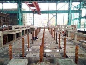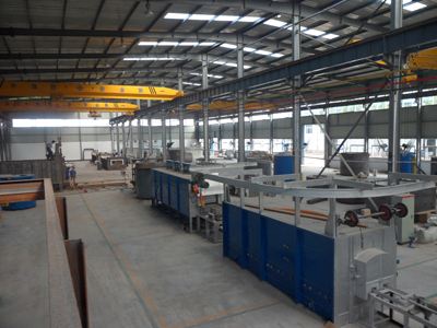 臺(tái)車式退火爐鋼 結(jié)構(gòu)主要包括爐殼支撐框架和驅(qū)動(dòng)設(shè)備支撐框架(平臺(tái)鋼結(jié)構(gòu))。考慮到爐殼潛在的熱脹冷縮因素,各段爐殼支撐框架與平臺(tái)鋼結(jié)構(gòu)采川相互獨(dú)立結(jié)構(gòu)。各爐段的底 輥室先安裝就位,以自己四角立柱為基準(zhǔn)完成4個(gè)基準(zhǔn)立柱焊接;再焊接左右兩個(gè)整體端板.而操作側(cè)和傳..
